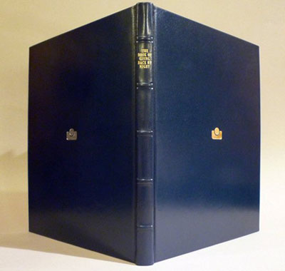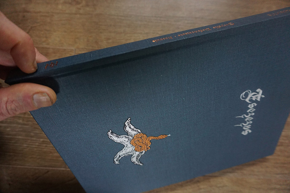 Released previously only as a 22-copy deluxe limited edition bound in midnight-blue goat-leather and papyrus (above) by Ars Obscura, this book is now available in a more affordable large-format (27.6 cm x 21cm) edition with midnight-blue thick textured card covers, printed with gold (right) and silver (left) pantone inks of the hieroglyph of Hrumachis on the front and back.108 pages.