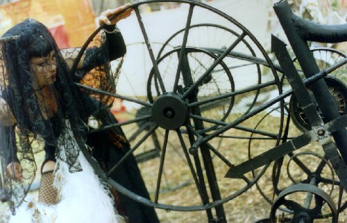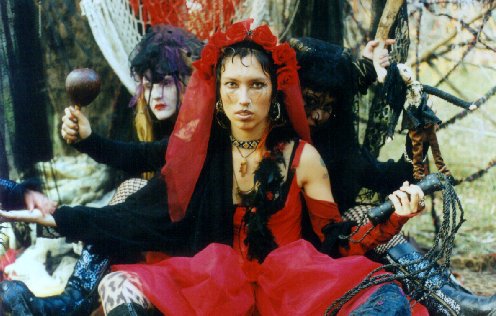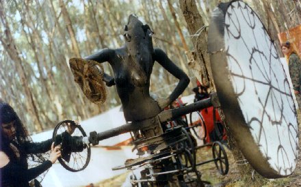 It was a learning experience- we had never done such a project before, and the subsequent performances and installations developed from this tumultous beginning. The second night of the festival it poured with rain so we didn't open the Labyrinth. After some repair work, we reopened on the final night of the festival, and the energies had settled enough by this time for a focused performance cycle. In contrast with the first night, there was only a gradual trickle of initiates, and events flowed slowly and smoothly, with enough space for interplay between characters to fully develop. The wondrous circling, cyclical nature of the Labyrinth emerged as a powerful magic from ancient times. After several days of intensive de-construction/ cleaning up we vowed we'd never do it again, but two years later found ourselves discussing ways we could expand upon and enhance the original concept. We now knew how to create and run a Labyrinth, so why not develop it further? The second Labyrinth, held at D.T.E. Confest Easter '97, was an even more spectacular and intricate event. We received more funding from D.T.E., who remembered our earlier achievement, and we had a stronger core group committed to the realization of the project. We decided to use modern technology to develop the same basic mythological/ magical premises as used in our first Labyrinth. This was a cooperation between Metamorphic Ritual Theatre group and others, with Robin of international industrial sculpture group Mutoid Waste Co. contributing a huge spinning sculpture spitting jets of flame in a clearing on the fire path and helping out with technical and sculptural aspects, Clan Analogue setting up an analogue synth hands-on workshop space way out on the fringes of outer space (a tributary from the air path), DJ Krusty providing beats on the last night, and Sydney band Dweller on the Threshold co-crafting the soundscapes with Mutation Parlour and the Mozart Project.