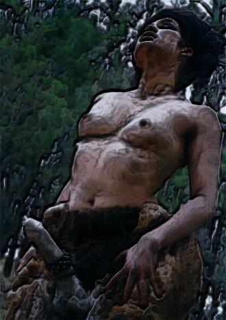 S/he paraded around the dome with bare breasts and large phallus (carved from a cow bone). This is the Age of the Hermaphrodite. Sun and Moon are united within in the alchemical marriage. I, too, became HermAphrodite from my role as Hermes, displaying my new symbolic bellybrand (see THE MUTATION EN- CYCLOPS-EDIA) and performing a Caduceus dance with snake-skins (stitched onto my arms in the parlour) and owl wings, invoking QuetzalCoatlicue