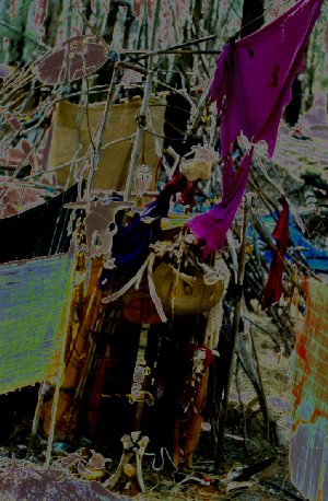 Following is an INTRODUCTION to the concepts of the LABYRINTH, with photographs, maps and accounts of our first two productions:The Labyrinth is an ancient pagan tradition existing in many cultures. It is basically a maze, usually spiralling, representing a womb. An initiate's journey in then out of the labyrinth was a symbolic death and rebirth experience for them. The Ancient Greeks made stone labyrinths, including the famous creation of Daedelus, in which was trapped the Minotaur, half-man, half-bull. The Druids, pagan priests and ecological protectors of England and Ireland's Celtic past, used to create labyrinths through the forests where they practiced their crafts, by winding ropes from tree to tree to form the paths. This is the method employed by Metamorphic Ritual Theatre to create the basic framework for their Labyrinth installations. The first, at DTE Confest Easter 95, was basically a traditional Labyrinth weaving, using no electricity or modern technology. Webs were woven with wool and string into the high and low ropes which formed the paths, becoming progressively denser and more textured towards the centre. The layout of this Labyrinth (designed by Orryelle, Bex and Ra'en) basically consisted of a spinning chamber which one would arrive in upon entrance, four spirals into the centre, and five elemental paths which connected these two main areas. Ancient myths from various different cultures (Greek, Norse, Celtic, Australian Aboriginal, Mayan) were woven together to form the essence of the performance/initiation cycles we presented upon opening the Labyrinth when the festival began. Initiates entered through the labia-like gateway, formed