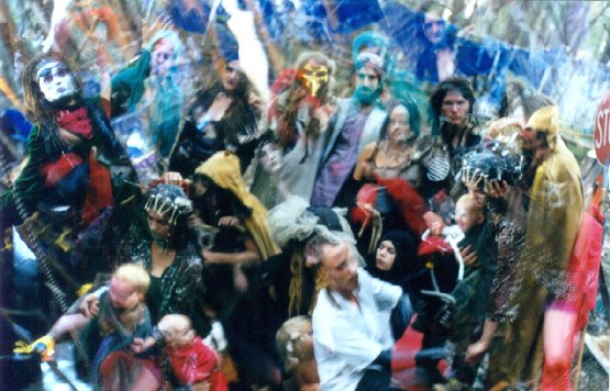 also the Egyptian deity representative of the successive Aeons. Thus this was the plan: ![]() (Picture above: Group shot of The 3rd Labyrinth cast and crew. Two shots at the end of the film overlapped...) That was the plan; here's what happened!: I don't think I've ever encountered as many mundane obstacles as for this third Labyrinth. Everything that could go wrong, did. Buses and even replacement hire-vans breaking down, communication hassles, people coming down with major illnesses, etc. But in the end it was all worth it. Fantastic installation and aeonic rituals! We truly created another world. Perhaps the ordeals even heightened appreciation of the eventual results? It was all very razor's-edge -just enough time to set it all up after getting there days later than intended (lots of people working flat-out -amazing co-operation), just enough string to fill in the framework we wove, just enough funding to cover our (many unanticipated) costs, the Labyrinth CD copies arriving just in time, etc. ![]() The first night was chaotic. The preparations were finished just in time to open. We were all exhausted but recharged incredibly on casting of the circle and opening of the rituals. Hundreds of people came through, it was a very fast and fiery energy. The little messages (words, questions, sigils and other triggers) the spinner (right) gave to initiates seemed to all go to the right people (even to the point of a silly one about slugs being received by someone whose nickname was Slug!), many of whom asked the Weaver about them later on their journeys. ![]() A strong induction of interest in Voudon in our clan (from several sources simultaneously) prompted inclusion of this aspect in our weaving. Our second intended performance night it poured with rain, so all we did was a short private ritual at the Elemental Crossroads, but this was very powerful: We combined the Voodoo tradition of burying and calling spirits into a head at the Crossroads, with a Marassa Baphomet rite by Louis Martinie, to charge up the Minotaur's head, decapitated on the first night's performance, with the energy of the Marassa/twins united into the hermaphrodite. We used the marassa-baphomet mudra and offered fruit, and blood from the piercings done in the Mutation Parlour (the gate of which was at the Elemental Crossroads) on the first night. ![]() (Picture at right: Ken who played the Osirian Minotaur) The last night we condensed the intended performance for the previous night and the finale into one night. The Osirian Minotaur was killed by Theseus-Horus, the generator was turned off at his decapitation. As Anubis in jackal-mask I weighed his heart against the feather and granted him safe passage in Amenta. The generator was turned back on and the lights and music wound up again as the new Aeonic cycle began... But a mere 8 minutes or so after the crowning of Horus as the new Sun God, the Lord of Force and Fire exploded our generator! Bang bang bang!! Lights and sound wavering then out, extreme gunshot sounds (someone thought Ken was *whipping* the generator!) and great sparks. So Maat entered the central arena in silence! -most apt for the Goddess of Truth. Gradually acoustic music began to emerge as she and Horus danced their union, candles being lit and torches shone. ![]() I appeared as the Baphometic hermaphrodite with goatskin and eaglewings. (My latex breast-job probably looked a lot more convincing in the candle and torchlight than it would've in the spotlight!) I took the silver cord from Maat as she and Horus sank united into the shadows, but Horus's golden cord had disappeared! He told me later that he had tied it securely around the hilt of his sword, but after slaying the Minotaur it had entirely vanished. No amount of searching in the subsequent week of unwinding at the site uncovered it! ![]() So the handfasting was not performed. Subsequent discussion of the aeonic meaning of this with the international HORUS MAAT LODGE decided that 'marriage' (even the pagan year-and-a-day marriage of handfasting) was an inappropriate metaphor for the union of Horus and Maat as incestuous twins (too formal, and She's already married to Thoth!) but it became evident that the union had occurred on some level -the Golden thread had crossed over onto the astral plane, where we traced it to the black light of Hunab Ku in a subsequent new moon working, while the silver cord (usually a metaphor for our etheric link to our astral bodies) had become physical. In terms of the original Theseus myth, the Golden Thread leads out of the Labyrinth. And indeed it has led me on to my next major project via that Working... (Photograph at left -Zya as the Weaver and her daughter Lilgimel as Arachne Jnr. -she hung bouncing from the webs in a decorated 'jolly jumper' spring device.)