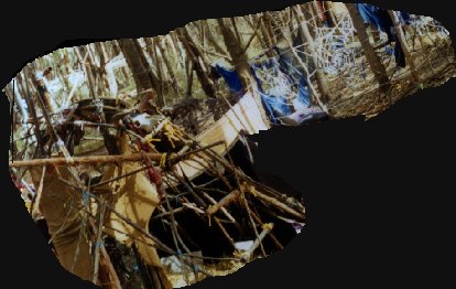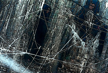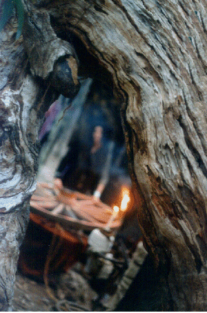 ![]() This time the Weaver/Mother's Weaving Chamber above) was seperate from the Dome where In-it-I-ates faced the Minotaur and the Cutter/Crone. ![]() Thus there were three seperate spaces for each of the Three Fates, who at the end of each night would converge (photo at right) in the central arena when Thesea/s faced the Minotaur. ![]() There was a large pit in the landscape which naturally formed this arena. Having no access to DTE's large metal geodosic dome this time, we built a small wooden one by bending saplings. This blended beautifully into the surrounding webbed woods. Amordios build a formidable gateway and antechamber (below) onto it where initiates about to face the Minotaur would await their fate one at a time.