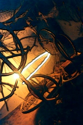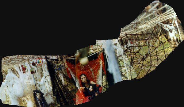 spiral castle of Celtic mythology where you go when you die.Emerging on top of the dome, initiates would then climb a rope ladder down to the Netherworld, a kind of 'cosmic waiting room' between incarnations. There they would remain until eventually Theseus arrived in the dome, provoking the final performance. Electric/electronic soundscapes created in the backstage area behind the dome begun as soft background noises when initiates were entering the Labyrinth, gradually increased in volume and intensity throughout the evening, until a full musical set accompanied the final battle. As with the first Labyrinth, various characters played acoustic instruments (drums, didgeridoo, violin, piano-accordian...) along the elemental paths, this time blending with the distant throb of the amplified central dome. This time Theseus was given an electro-sword, which sparked and crackled spectacularly when scraped along the metal of the dome structure. The generator was switched off when the Minotaur died, causing all lights and sound to de-generate into blackness and silence. From this rose an acoustic chant chorused by all the people involved in the Labyrinth's construction and enactment, the sound circulating as they formed a human web around the dome. Seven different chakra tones ascended the musical scale as the Minotaur ascended the seven steps of the spiral staircase, climaxed by a red flare shot off into the heavens with his spirit. Then Atropos cut the threads surrounding the Netherworld, releasing everyone down the spirit path to be reborn. The vagina for this second Labyrinth was a long fully-enclosing red stretchy fabric tunnel, so the effect when one eventually popped out the end of it, through the labia gateway, was quite divine!