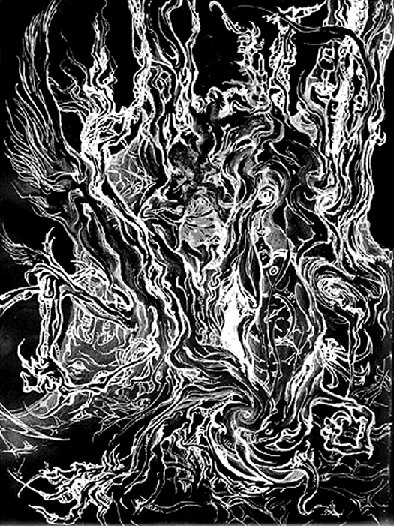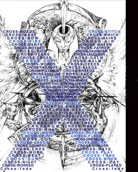 If you are familiar with that ancient Book of Symbols The Tarot you will no doubt have noticed that the Ten Spokes of Tradition (the sephiroth of the Qabbala) on the Wheel above have been replaced with the eight spokes of the Chaosphere. The result is indeed chaotic in it's dimension-bending fract(ur)al Complexities. Bored of 'e-turn-all-y sitting on her spotty toad stool, Hekt (Egyptian frog-headed Goddess)-Ate her own timespun tapestry, and as Hermanubis Nexhagus I jumped off her wheel and onto her back, riding the frog to Arcana 23, Outside the Circles of Time. Here the physical and the metaphysical inter-sect. Bodies, Forms, Ideas, Words, Sounds, and Images are dissected and reassembled, metamorphosised in the cauldron of chaos. Select a section from the Cross-Section over the Wheel of Fate above -or from the more tabulated index below- where new information is inputted, upcoming projects are heralded in advance, linked in while in process, re-presented and re-corded, and eventually condensed and filed into other categories as they pass from currency (of course, some are re-current). New files are created to contain those passing events or information which don't/won't fit in any established category; and some of the data which crackles through this nexus point refuses to be contained, flying off back into the ether from which it was spawned. Now this Virtual Mutation Parlour sits as a Crossroads in the vast virtual labyrinth of the internet, the world-wide web. From humble beginnings, it has become a veritable nexus-axis of ideas and forms. Cross-communication/ cross-pollination between different cultural and subcultural tribes, clans and individuals is encouraged. I don't usually mind people borrowing bits of my art or text for their own sites; I just like to be asked first, and assure the appropriate credits and links are included, thereby facilitating the distribution of information... So please e-mail me. We dwell at the Crossroads, the Crossways, where the ancient Goddess of Fate -Hecate, also known as Orchill, or Urdu, though oft she wears a triple veil- intertwines the dark and bright threads, weaving under and over, under and over, down through the underworld and up through the overworld. The Mutation Parlour is a Cross-stitch in the fabric of eternity, the tapestry of time, spun through space. Chthonos, Ychronos, we evoke thee. Electro-magnetic wwwebs crackle with the influx to this nexus, in-it-i-ates drawn to the Mag(us)Net. And as outward from this nexus our own virtual website grows within the vaster labyrinth, so too shall our physical web-sites grow. The etheric framework of future physical Labyrinth projects is being woven herein. Once remanifest, they will link back into these cyberwebs. This virtual parlour is the Crossroads between the unmanifest and the manifest, where via Logos and Imagos we bring things into being. Physical projects of the Mutation Parlour, of Metamorphic Ritual Theatre and other affiliations of the HermAphroditic ChAOrder of the Silver Dusk shall be recorded herein, where they shall be digested, mutated and spat back out into the wo/manifest world in new forms.