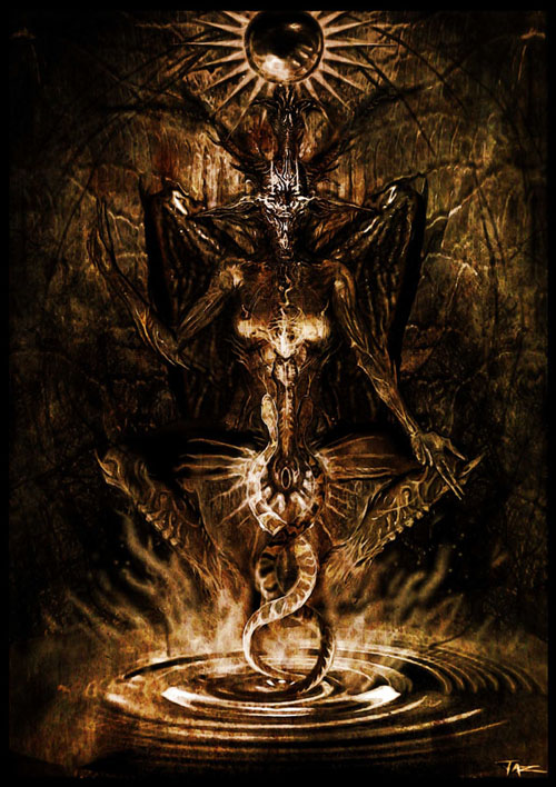 | Whilst we dip our heads in the Well of ReMembrance, our Guardian Angels look back upon us from the future Aeon of Truth, guiding us towards the mutant gestalt of double consciousness, and the weighing of our en-lightened hearts against the Feather. As aeonic srehctaWatchers and Arachnean Timelords andna seidalemiT we weave the double current of Horus and Maat forwards andna sdrowkcab through the eternal Crossroads of the Nu Present which we are forever opening in curious wonderment! Through both private and performance ritual, we impose order upon the chaos of the universe, magically creating events and artworks from our unique synthesis of different chaotic elements. Even as we act, we acknowledge the absurdity of ordering chaos, and revel in this absurdity; for what is the universe entire anyway but layer upon layer of profound illusion? And so we laugh as we create. ![]() 'Baphometisphere' painting (c)'07 Taz (iMage inspired by a visit to the Silver Dusk astral temple)