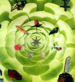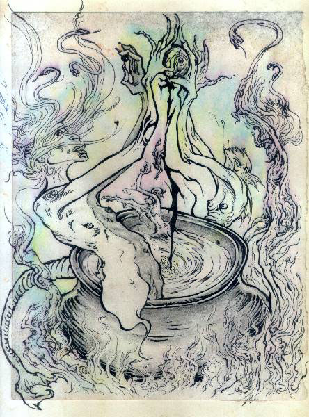 GLOBAL SVADISTHANA CHAKRA WORKINGAstral Sabbat, 19th February 2000 full moon. Planetary Focus Point: Lake Titicaca, Bolivia, South America. ![]() Floating ecstasy Fluidform space Shifting shapes Losing weight Drifting through fleshscapes This is the nu flesh Maleable, plasticine Yet somehow tangible Sensation within mutation Black wings bearing us through the night Chiaruscuro of patterned colours bright Moonmoth of Ganatahuti Thoth Drawn to the candlelight Between Baphomet's horns Shub Niggurath gargantuan behemoth Undulating with insatiable delight Black goat with a thousand young Wings of coal and triple tongue Of fire, endless desire, bliss of ever-resurgent Breath from death Vive vel ThanatEros Even as we Order the ChAos A strange attractor enters a defacto Relationship with our Sahu Surrealist twinings of limbs and tongues Tantric voodoo, Obsidian divinings, Lunar limbo, illusion's silvery sheen Lucid physicality, solidified dream We are the Nu Flesh The semiconscious mesh Of form and fancy Metafetish fantasy The fertile earth The bubbling cauldron, the unknown other Catching the moon, her hornéd lover In the chalice of the Earth mother The silver cords draw together In a dewy web of crystalline ether Hecate's web, the lake´s ebb And flow under the spider´s tide On a sparkling trail She rides The gentle lapping waves Rolling in the Moon To shore, we draw Her down in our frenzy Of love and lust, we bask In Bast´s gossamer glow A purring mass of seething teething glassy mirror flame Warm and wet and glistening with The Secret game Veils are rendered and renewed A feflective fabric of coagulation shewn Hail the Incan Moonmother, Kia, The Sabbat roiling in her ancient temple hearth A vision of elation brought to Earth Reified in Zos, the hand which hosts The astral eye, the Rabbit in the Moon, The castle in the sky The seeds are sewn in cauldron Lake In 9 months, of what to make? -Kia vel Eros 3/2000 ![]() We resonated intensely with Gaia's Muladhara Chakra, Mt Shasta, California in October 99. This working -the Ten-star Weaving earthing the Starstone Temple of the A:.A:. - activated links with Gaian kundalini energies and inspired the nature of the global Svadisthana working. The Svadisthana or navel chakra is of a lunar nature, thus like its corresponding lunar sphere on the Tree of Life, Yesod, the working was primarily astral. It was a traditional Witches' Sabbat, existing behind the veil, on the edge of our conscious minds. While the Muladhara/Malkuth working was of an appropriately physical nature, piercing and weaving together the ten initiates and the sephirothic energies they had each invoked into the web of matter, the Svadisthana working was an intricate lunar dreamweb. Networking was done via snail and email and All manner of sorcerors, magicians, witches, warlocks, mages, sages, satyrs, maenads, mutants, beasties, fae and otherkin beings converged for a great sabbatical congregation around over and within the waters of Lake Titicaca. Sexuality and sensuality are major aspects of the Svadisthana chakra, so these were exploratory foci for connection within this Great Rite. We unite with our greatest fantasies and conquer our greatest fears and inhibitions in the Com-Union-al celebration of diversity. The astral plane is the realm of pure unmediated fantasy fulfillment. Thus we celebrate the total freedom of Love under Will. The Svadisthana chakra, located about three finger-breadths below the navel in most systems, and also centered in the genitalia according to some of the Hindu tantras, is the storeplace and circulator of energy throughout the body, in ancient Chinese Taoism the cauldron of chi (energy). We danced around the Gaian macrocosm of this cauldron in wild abandon at the Svadisthana Sabbat, brewing within it the Vinum Sabbati of our united sacramental concrescence within the lake... impressing the ether and the Gaian noosphere with the bliss of fulfillment and ecstatic release in the Sabbatic Tradition. We shared this experience through simultaneous sexual activation of a common symbol, on the specified date, to link us and unite our souls in joy: ![]() This sigil-key was inspired directly from and immediately succeeding the activations of Gaia-N'aton groupmind kundalini with the Muladhara working at Mt Shasta. The original master sigil was consecrated locally at Gaia's Svadisthana chakra on the Feb. 19th full moon, placed within an outwards-rippling mandala on the Bolivian Island of the Moon (along with a small piece of the moon donated by Alobar, the Yesod throneholder in the 11-star Working of the Horus-Maat Lodge), then cast into the surrounding waters of Lake Titicaca, Gaia's sacred Svadisthana cauldron. Those activating copies of the same sigil translocally upon orgasm sent their energies and travelled astrally to the great congregation thereby. Psychoactive sacraments, befitting the dreamlike nature of the rite were also employed by some to help facilitate their astral travel to the lake. The link activated with the sigil was enhanced via meditation upon the Svadisthana chakra - contemplating one's navel!, or more specifically the energy centre three finger-breadths or so below the navel. The colours attributed to this chakra are alternately orange (in the spectrum working up from the base chakra red) or a lunar silver. It's tone is an extended '0oooh' (as in moon) sound, with pursed lips. N'aton (a name for the collective consciousness in Maat Magick ) is the great Child of the Sabbat, the collective result of this com-union. She-He is the groupmind, the human potential, the astral homunculi brewing in the Svadisthana cauldron-womb of Gaia, the coagulation of the pleasures and desires dissolved in the Vinum Sabbati, the wine of the Sabbat, potentiated by the psychic link of syncronous rapture of release. Following is my personal account of the Working I performed at Lake Titicaca, Gaia's Svadisthana chakra, on the Feb. 2000 full moon to earth the Svadi