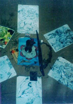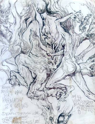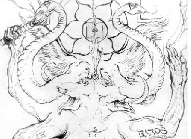 to Svadisthana due to its sexual and sensual aspects;![]() and a drawing by my friend Innana (right) which has an appropriately lunar and Arachnean feel and imagery, also providing a conduit for her and other Australian participants to tune in to. After laying out the pages I drew more rounded petal-shapes in the earth with the Ekudanta DraQyl staff, then expanded this out to form the Ganesha yantra, as like the svadisthana chakra it has a six-petal lotus central. As I did this I chanted Ganesha mantras. Om Gam Ganapati Namah. Om Shri Ganeshayanara. I began to feel his large and joyful presence... After I had completed this mandala, I stepped back and looked at it. It didn't look or feel quite right, something to do with its positioning and angle it seemed... I shrugged and took out my instamatic camera to record the mandala. For three shots in a row the flash for no apparent reasion did not go off; by the third (I only had one roll of film) I took this as a sign that something was definitely wrong. Putting camera aside, I contemplated the mandala for a while, then realized it was supposed to go on top of the original sigil I had drawn in the earth. I had created two 'centres' and they needed to be overlapped. So I took the stang out of the ground, thinking, 'now where the fuck will this go?' and placed the central mandala and pantacle over the sigil, rearranging the talismans and petal pages around it. Then as I placed the copper chalice on the pantacle it struck me... of course! In this Great Rite the spirits were demanding I unite the staff and cup. (where the fuck indeed!) With great reverence I slid the stang, candle still lit between the prongs of the antler, into the water within the chalice. There it remained throughout the sabbat, a totem of divine union -the YoniLingam. ![]() I redrew the Ganesha yantra around the mandala, while chanting a Ganesha mantra. I flashed on Hir as the Double Wanded One, Baphomet with double genitals as in one of picturepetals of the mandala. I returned to the centre and began to masturbate while staring at the patterns of the various mandalic layers, feeling their etheric ripples within the Incan temple space. The sexual energy there was incredibly intense, I felt immediately and immensely aroused. The 8* deepened my gnosis. I could feel various spirits and elementals spiralling around me and the svadisthana mandala. I built my energy further with pranayama, using only the left nostril and Ida channel to further facilitate a dreaming trance and Yesodic astral receptivity. I saw Dwimukka Ganapati again and a third face formed from and betwixt the other two -now becoming Trimukka Ganapati, the three-faced form of Ganesha. ![]() Hir great curving tusks were the waxing and waning moons, and the circle in the centre of Hir yantra before me reflected the full moon above. I dropped the moonrock Alobar (Yesod throneholder in the 11-star of the HML) had given me into the chalice. An actual piece of the moon (from a comet colliding with it), this seemed like the perfect magnet to 'draw down the moon' and fill the cup with lunar energies. I poured some of Peter (Malkuth in the 11*)'s home-made Abramelin oil in to help earth the rite and provide another link and a distinctly thelemic element, also adding amber (burnt and crumbled on the candleflame) and other assorted sacraments to the chalice. I was creating a Vinum Sabbati -the energies of various translocal participants were going into the sabbatical 'cauldron' brew along with their talismans. All the while I chanted continuously the 'Oooh' tone of the svadisthana chakra, which rippled through various gentle harmonic fluctuations... As I began to masturbate the visions came through more powerfully, borne on moist wings of rapture. Spirits swirled into a whirlpool centred arond the cup and stang and the svadsithana mandala rippling aout from their conjunction. Like a giant hymen the veils tore asunder and witches wetly straddling their broomsticks, cavorting satyrs and lust-maddened maenads poured in writhing throes into my widening field of perception. Great Long spindly limbs reached through the undulating hordes, drawing them together, drawing them into convergence: The many arms of Arachne, the lunar spider-Goddess of Fate. She wove a great web with the silver cords stretching from the navels of each participant, a web of dreams and fantasies, meshing together the silver strands of ether into a tantric tapestry of delight. All manner of strange creatures writhed through the throng: creatures of hoof and horn, creatures of wing and tail, of feather and scale borne on musky currents of freeform ecstasy. Couples drifting in tandem, merging together and apart in liquifying fractals of flesh. I recognized some of my friends within the attendees, glimmers of familiarity in faces warped by fantasy. A couple of kin from Australia flew past conjoined, in forms of sleek black, dragonscales yet somehow also panther fur. I felt the energies of mages of the Horus-Maat Lodge I had recently met. Others were masked beyond recognition, and there were many there I knew not, disincarnate spirits attracted to the gathering as well as the astral bodies of physical beings. I was riding amidst these phantasms, adrift in the mists of Kia, stretching paws and wingtips of delicate stroke brushing against the formless flesh of the witching horde; a shimmering vibrating breeze of light amidst the undulating sylphs and winged salamanders; and yet too was I aware of Zos, my individual physical self rooted to the earth, toes clenching in the dirt, phallus held lightly in hand. I stroked myself gently like the winds which swirled cooly around my face and neck, then harder as the vapours coagulated into airborne pools of molten bodies, splitting and merging in endless copulation. I moved away from the central mandala to the candles I had set in the altar alcove of the earthen gateway-patterned temple wall. I took out my journal and pencil