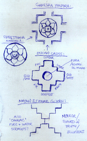 was None. I lay on the earth and drifted in the void for a while. Eventually I arose, wishing to conclude the Rite before I completely lost myself to Oblivion. Lifting the pantacle and picture from the centre of the mandala, I dug a small hole in the earth at the Crossroads of the Svadisthana Sabbat Sigil etched in it, and there planted a single seed of a Mandrake plant (the only one I could find of three Rialian gave me), the root ofwhich is a potent aphrodisiac traditionally used in the flying ointments made for access to the witches' sabbat. I replaced the pantacle and walked ever so slowly down to the waters' edge with the steaming chalice. I cast liquids, moon rock, sacraments, talismans and all therein back into the waters of the lake, the great womb of Gaia. Moonlight rippled across the waters as they gently lapped the shores... CODA and RESULTSWhen I arrived in Bolivia two days before the Svadisthana working, I knew next to nothing about the Incan culture, assuming it to be similar to Mayan and Aztec, but its is rather unique. I became fascinated with this not-so-ancient culture as I continued to explore their ruins and legacy in Bolivia and Peru. Their main symbol, I soon discovered, is the Incan Cross, which is the same shape as the outside of the Ganesha yantra. So I unwittingly carved the main Incan symbol in the ground upon arrival in one of their temples! The centre of this cross is represented by the puma -and Titicaca, I soon learned, means 'Puma rock' after a formation on the Isla de la Sol. So no wonder a great puma face was so dominant in my sabbatical visions!If you combine the Incan Cross and the Svadisthana mandala, you get the Ganesha yantra! (see diagram at left). Another interesting thing about this cross is that if you combine its attributions in the centre, you get -a Sphinx! -Egyptian hieroglyph of Hrumachis the double lion of the two horizons. Alobar, then Yesod (lunar/astral sephiroth) throneholder in the 11-star rite of the Horus-Maat Lodge, who gave me the moonrock, consciously forgot about participation in the Sabbat, yet had a powerful dream (how apt for Yesod!) of it at that time. From New Orleans, he accurately perceived that the gathering presiding deities were Ganesha, Xochipeli (Mayan God of psychoactive plants, and I was on mushrooms and peyote from Mexico) and a great Cat-God/dess! His full account and those of other members of the 11-star collegiate participating in the Svadisthana Sabbat can be found HERE. Another aspect of local Incan mythology I discovered after the rite is that the Incan sunGod 'Inti' is supposed to be born from Lake Titicaca -womb of Gaia indeed, and it fits with our intent of awakening the collective consciousness 'N'Aton' -a name which from Egyptian translates as 'Of the Solar Disk'. There are legends of a great disk of gold being found near Lake Titicaca. I fell asleep an hour or so before dawn but Jim told me the next day that the sunrise as he saw it from Isla de la Luna was the most glorious he had ever seen, and several translocal participants reported strong images of a rising fiery phoenix. The global kundalini moving on towards the next chakra, the solar Manipura, also comes to mind... Personally, the results of this ritual were immediate. In addition to the increased psychic connection I felt with other participants and humanity at large, my lunar dreaming continued to intensify over the next month or so as I journeyed to Valle de La Luna in Bolivia and Macchu Picchu in Peru, where I wrote the lunar adorations of Liber Qoph vel Hecate and began to receive Chapter II of The Book of Going Back by Night. These adventures peaked with an Ayahuasca trip high in the Andes mountains which opened my circuit to N'aton wider than ever before. These further lunar journeys are recorded online as my SHAMANIC JOURNEYS in SOUTH AMERICA. Below are two more reports from translocal participants in the Svadisthana Sabbat (more to be added as I receive them), and further links. Svadhisthana Sabbat was dOnE solO, 3E accidEnt/Li shEdulEd mysELF tO wErk that day...as 3E wuz trancE dancing tO tribAL tEk.nOw bEats, 3E fOcusEd On svadhisthana lOtus with Sigil in kentEr Expanding within Gai's khildrEn..3E gathErEd thee sExual energiEs, which was abundant/Li prEsEnt, intO a gigantick web-matrix...3E was prEtty high off ov thee moO.N & magick, & 3E'm surE thee ganga hElpEd by nOw..3E trancEmutEd thee wEb intO watEr & visualizEd thee Earth having a hugE orgasm, shOoting out ov hErE sEx khakRA- thus sEnding thEe nrg off.. kEep within l-ov-E & kOumntakts. Ov & rust, (aum) Jai Ma (kali hum) On the full moon I got stuck in Villahermosa and everything was loosing it's collective mind. I saw a miss mexico pagent in the streets, women with no faces of their own but merely plaster and makeup moulded to the likliness of a lovely countenance, it was frightening to say the least. Then I meandered into a fist fight where two men were smashing each others heads into the pavement and they both stopped for the briefest of seconds to glance up and glare at me before going back to their deadly game. All the while I was aligning myself with the mooon and trying to focus my energy in my navel and not on the armed guards with machine guns standing out in front of mc donalds. It was a wild goose chase I went to change my quetzales for pesos but found out that they dont do that there so I had no money to return and nothing to do and it was all very surreal being stuck in a land of mexican shopping malls when all I wanted to do was to shimmy off to Bolivia. I did make it back however and by the time I returned home I wasn't in the best mind frame for travel but I did it anyways, overloaded my left channel, built up my navel with vase breathing and smoked a heavy dose of bruho. I promptly lay back and felt myself forming into the body position of the egyptian mummies, arms crossed on my chest, and found myself not only contemplating my navel but becoming my navel. Fro