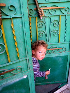 Now we were eleven- including one-and-a-half year oldFox (guarding the temple door at left -photo by Tor) who loved to sit and chant with us, adding hisendearing and often comical touch to the proceedingswith his high-pitched oooos and aaaahs and makeshiftyoga asanas twixt shifting from one cross-legged lapto another around the circle.