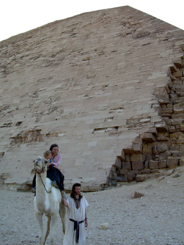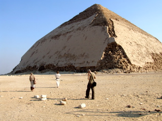 From the Red Pyramid we went to the nearby 'BentPyramid' which though unenterable is uniquelyspectacular from without: Its angle changes two-thirdsof the way up (thus the name) and it is the onlypyramid which has retained most of its limestonecasing, unable to be as effectively pillaged over themillenia due to these angles. The casing gives thepyramid a smoother and lighter appearance so that itshines white-golden in the searing sun.