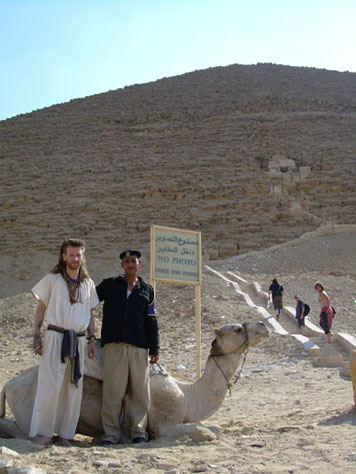 Where the casing was missing on the corners, juttingangular stone blocks were able to be climbed easily,and to my surprise the caretakers of the site werequite happy for me to scramble half-way up (therebeing no other tourists about) to view the surroundingdesert sands and pyramid complexes from this vantagepoint. Below, Dorryn tapped sticks together andchanted himself into shamanic trance in the shade onone side of the looming edifice.