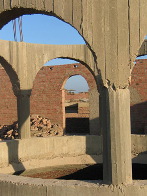 The space helped align our spirits and sounds rapidlyalso: the unfinished temple was a large brickhemispherical dome, with eight arched gates (left- photo by Liz) in theadjoining unroofed smaller round room above it. Theacoustics of the space are incredible, highlyreverberant as if it was made for a throat chakraworking. Several times over the course of ourprogressive work there I was overwhelmed with how mucheach syllable resonated around the dome, making oneintensely conscious of clarity in focusing the Powerof the Word.