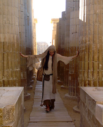 Photo at left by Orryelle: Giselle amidst the golden pillars of Saqqara