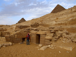 From there we entered the Queen's Pyramid, a smallpyramid beside The Great Pyramid. The tomb within was quite deepdown inside and the heat of the desert day had alreadyhit us enough for appreciation of its shady depthsafter the steep descent. As our guide -a man from AbuSir village whom Nasser had organized to just tell usthe basics about each site then leave us to ourmeditations in each- had the guard turn out the lightsfor us (small baksheesh from the group given for thisfavour) and we spent about 20 mins in there alone, agreat start to our day at the site, which later becamea lot more hectic.