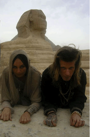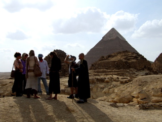 When we emerged out into the day there was a palpablechange in the atmosphere. The light was of coursestill strong in contrast to the dark interior, butrather than more intense heat as we had experiencedalso *within* the sweaty confines of the pyramid,there was now a cool breeze blowing, and the sky wasscudded with grey clouds, something quite rare inEgypt. The breeze was invigorating, increasing thesense of rebirth and renewal as we emerged one by oneinto the daylight. Stretching my arms and torso up tothe heavens in gratitude, Giselle and I performingvarious Egyptian asanas on the ridge beside thedoorway from the shaft, the strangeness of the scenebelow only gradually dawned on me: There was a hugethrong (over fifty?) of Egyptian people, mostlyteenage girls in their shawls and headscarves,clustered there in an excited burble of acclaimingvoices, some looking up at Giselle and I, othersmobbing the others below for autographs, like somearchetypal rock-star scene with an eastern twist.Since pretty much all of modern Arabic society inEgypt is devoutly Muslim, appreciation of pharoanicculture is only permitted in terms of historicalcuriosity, but there was something strange going onhere -something like a subconscious culturalrenaissance. They sensed the energy and power of whatwe were doing, and could do naught but show it!