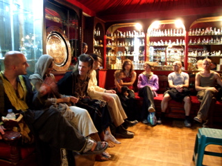 Somehow this trance was diverted into a Perfume Shopjust outside the gates of the Giza site complex as itclosed. We were kind of stunned from our deep day andits intense energies, and through some strange lateralcommunication between our departing guide and hisassociates we were ushered like zombies into a largeand decorous shop full of shelves lined with beautifullittle fine blown-glass bottles of aromatic essences,seated and offered cups of tea and coffee. It seemed a welcome rest and break at first, and because Nasserwas back with us and seemed relaxed we wereunsuspecting until the owner began his extensive spielof welcoming us and appreciating our work which soonapparently turned into the usual sales-pitch we hadmanaged to successfully avoid for the rest of the day. Several of us snapped into realization at this pointand went outside, where we conferred that this was abit off the path of our day's plan. I went back in andsuggested to the others that we should leave as westill had a whole evening's further ritual ahead of usto really earth the work; but Giselle was by then inthe midst of sampling seven aromatic oils for theseven chakras, and asserted that we were actuallythere for a reason as she had wanted for a while toobtain such essences for our Em'balming work. While thesalesman who insisted on his pharoanic descent (largehands as demonstration?) seemed dubious with hismummified hawk ('This is the original Horus'!), thestrange side-visit did indeed turn out to besynchronous in that the perfumes she obtained wereused that very night to help facilitate the finding ofour Words of Power.