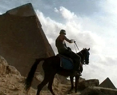 Performing pranayamas to maintain and deepen thegnosis, I found Bastrika (firebreath) to fit well with the staccatorhythmn of the camel hump bumping up and down beneathme. But I would lose track of my breath periodicallyin my marvelling at the sheer majesty of oursurroundings: low walls of ancient stone mastabas andtemple ruins crumbling back into desert sands, theother pyramids looming up on the bright blue horizonwith the impressive grandeur of their ancientmonumentalism. Wind-worn and sandblasted, they are soat one with the desert, looking as if they have justbeen there for ever despite their strange symmetries.