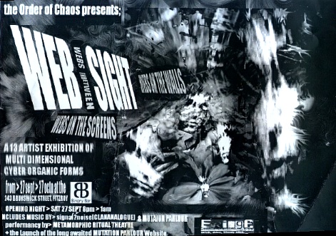 On the opening night of the exhibition -Saturday 27th Sept 8pm-1am- a performance by Metamorphic Ritual Theatre linked together the webs on the walls and these webs on the screen. Accompanying music was provided by Mutation Parlour, whose manifested lineup for this particular event was: